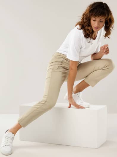 Die vielseitige Cityhose: Mit ihrem Materialmix aus weicher, atmungsaktiver Baumwolle, strapazierfähigem und haltbarem Polyamid sowie Elasthan für mehr Formstabilität und Bewegungsfreiheit bringt sie beste Voraussetzungen für den Alltag mit. Die natürlich matte Oberfläche der Baumwolle erhält durch Polyamid und Elasthan einen leichten Glanz - das wirkt modern und stilvoll, ebenso wie die 7/8-Länge. Die vorverlegte Seitennaht schmeichelt der Figur. Auch die Pflege gestaltet sich einfach: Bügeln ist durch die knitterresistenten Eigenschaften von Polyamid nur selten nötig.