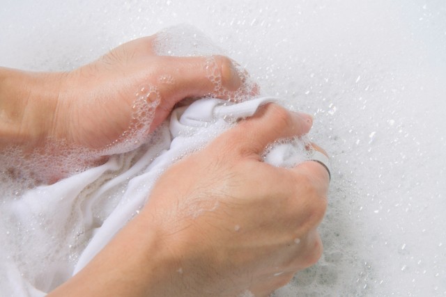Zwei Hände, die einen Stoff mit der Hand waschen.