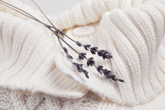 Nahaufnahme eines weißen Wollpullovers mit feiner Struktur und einem Lavendelzweig.
