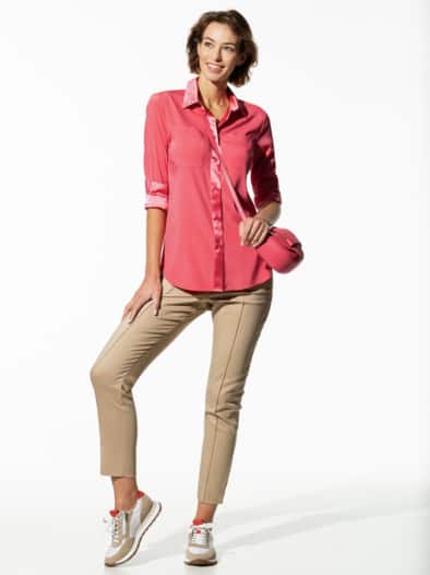 Hoch zu schließender Blusenkragen. 2 Brusttaschen. Langarm mit verstellbaren 2-Knopf-Manschetten. Rückenpasse. Abgerundeter Saum. Länge ca. 68 cm in Gr. 42. Druck: komplett glänzend. Uni: Rumpf und Ärmel matt, Kragen, Knopfleiste und Manschetten glänzend.